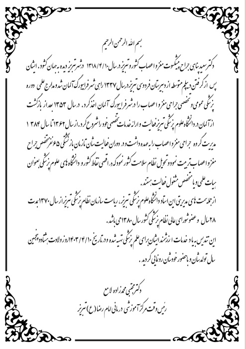 شایان ذکر است: در این برنامه تجلیل، تندیس این استاد بزرگوار با حضور خانواده محترمشان در قسمت ورودی گروه جراحی مغز و اعصاب جانمایی شد و همچنین کلاس آموزشی این گروه بنام این استاد گرانقدر مزین گردید. با آرزوی سلامتی و طول عمر