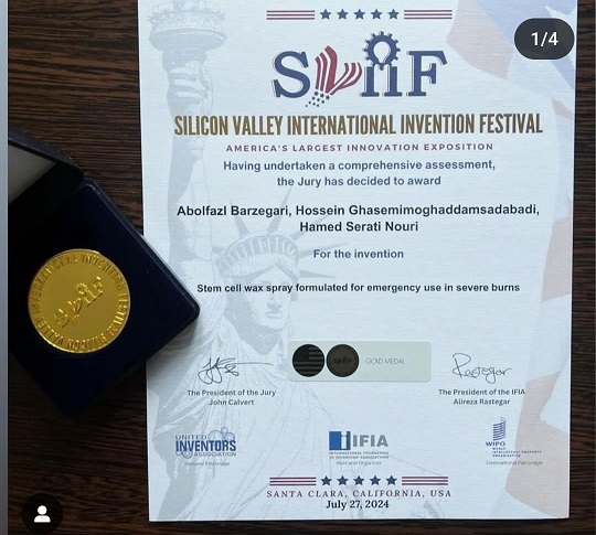 بنا به همین گزارش مدال طلای فستیوال جهانی ابداعات و اختراعات آمریکا به محصول اسپری واکسی پوشاننده زخم و سوختگی حاوی ترشحات سلولهای بنیادی بعنوان دومین شرکت تولید کننده در جهان اختصاص یافت.