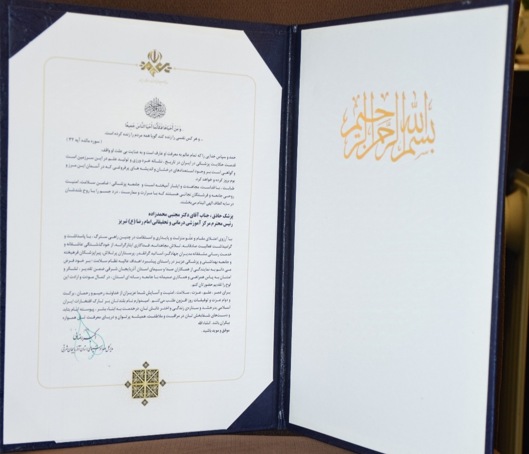 تقدیر مدیر کل صدا و سیمای استان آذربایجان شرقی از مرکز آموزشی درمانی امام رضا(ع)