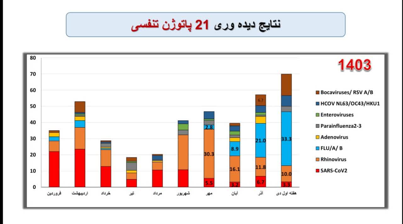 بنا بر اعلام مرکز مدیریت بیماریهای واگیر وزارت بهداشت به منظور رصد و پایش ویروس های در گردش بیماریهای حاد تنفسی، دیده وری مولتی پلکس(21 پاتوژن تنفسی) در دانشگاه های منتخب علوم پزشکی تهران، ایران، هرمزگان و شهید بهشتی در هفته اول دی ماه (که حجم نمونه یک چهارم حجم نمونه ماهانه است)، آنفلوانزا (با نسبت ۳۳٪) شایعترین پاتوژن تنفسی در نمونه های بررسی شده بوده و همچنان روند افزایشی نشان می دهد. و در رتبه های بعدی رینوویروس (با ۱۰٪) و کووید (با ۳.۳٪) قرار داشتند.
