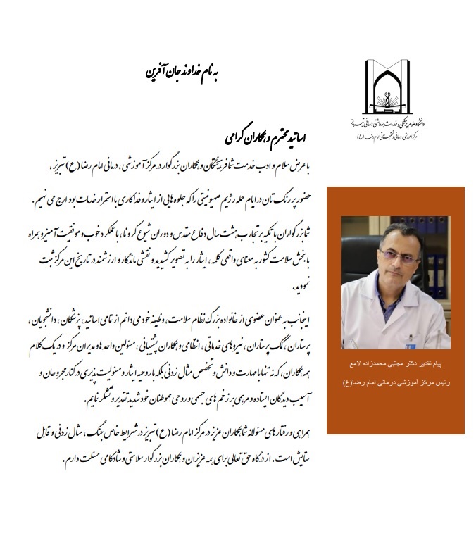 تقدیر و تشکر دکتر محمدزاده از کادر مرکز امام رضا (ع) تبریز تقدیر کرد. کد خبر : 77120 کپی کلمات کلیدی : بیمارستان امام رضا (ع) تقدیر و تشکر دکتر محمدزاده لامع