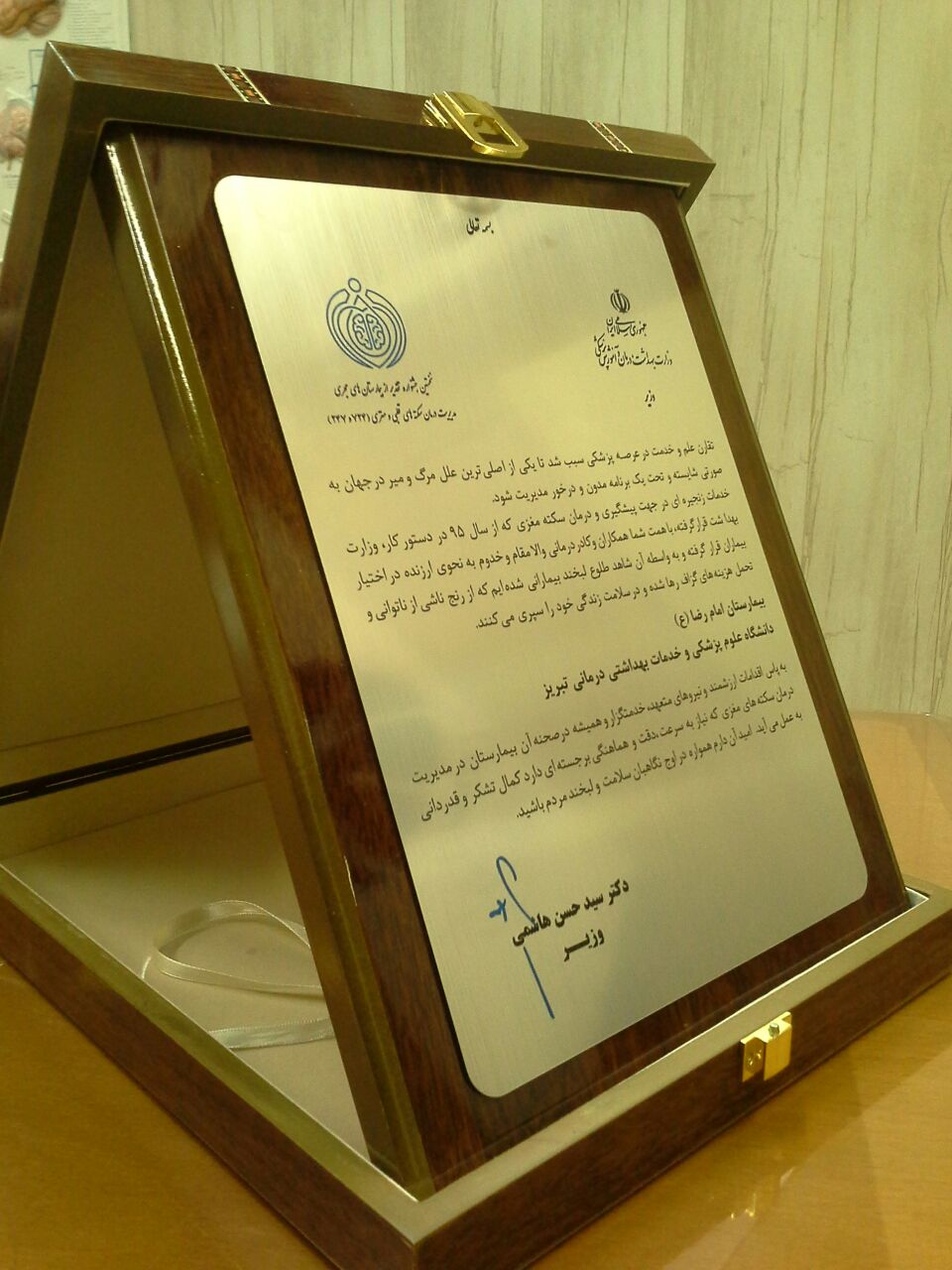 بیمارستان امام رضا(ع) دانشگاه علوم پزشکی و خدمات بهداشتی درمانی تبریز/به پاس اقدامات ارزشمند و نیروهای متعهد، خدمتگزار و همیشه در صحنه آن بیمارستان در مدیریت درمان سکته های مغزی که نیاز به سرعت و دقت و هماهنگی برجسته ای دارد کمال تشکر و قدردانی بعمل می آید . امید آن دارم همواره در اوج نگاهبان سلامت و لبخند مردم باشید .