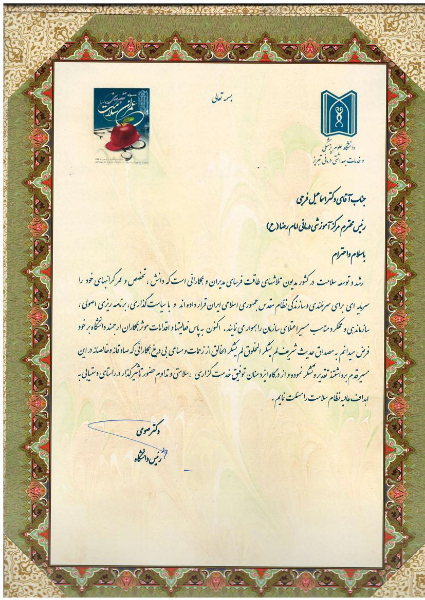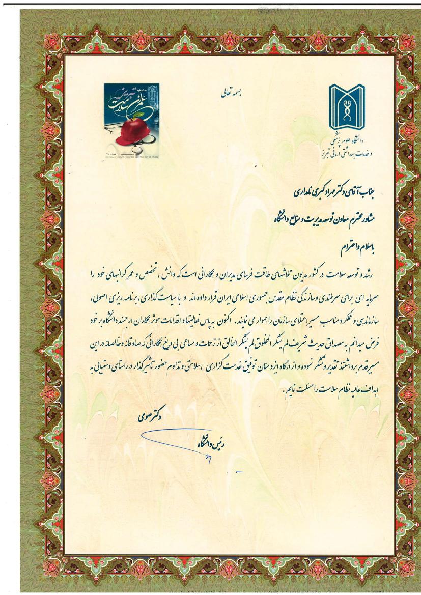 به گزارش روابط عمومی دانشگاه علوم پزشکی تبریز ، در جشنواره عمران سلامت تبریز از دکتر صدر السادات معاون توسعه مدیریت و منابع وزیر بهداشت ، درمان و آموزش پزشکی و تعدادی از زحمتکشان عرصه عمران سلامت تبریز تجلیل شد .