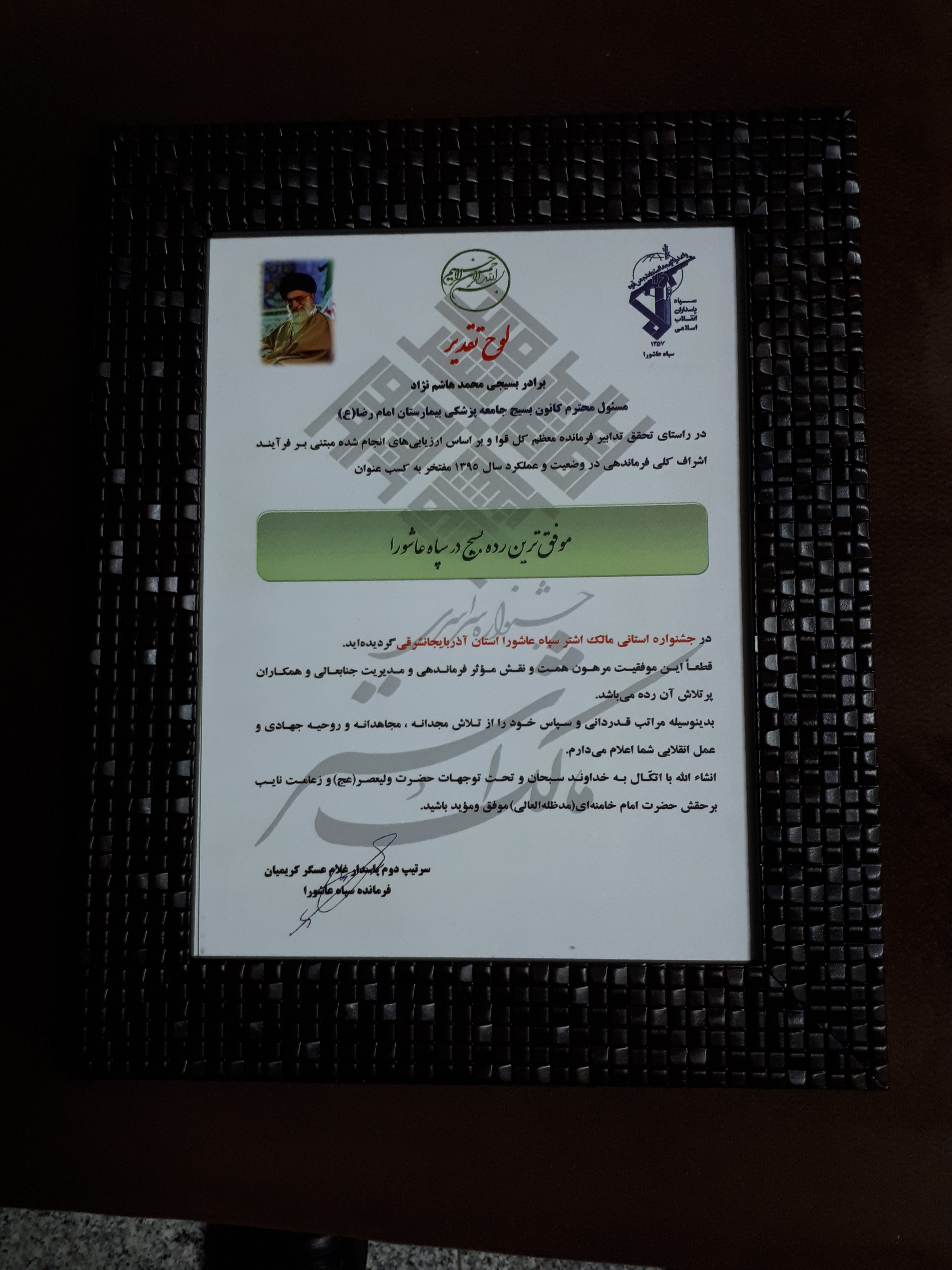 محمد هاشم نژاد مسئول کانون سازمان بسیج جامعه پزشکی بیمارستان امام رضا ( ع ) از سپاه عاشورا به عنوان موفق ترین رده بسیج در سپاه عاشورا لوح تقدیر دریافت کرد .