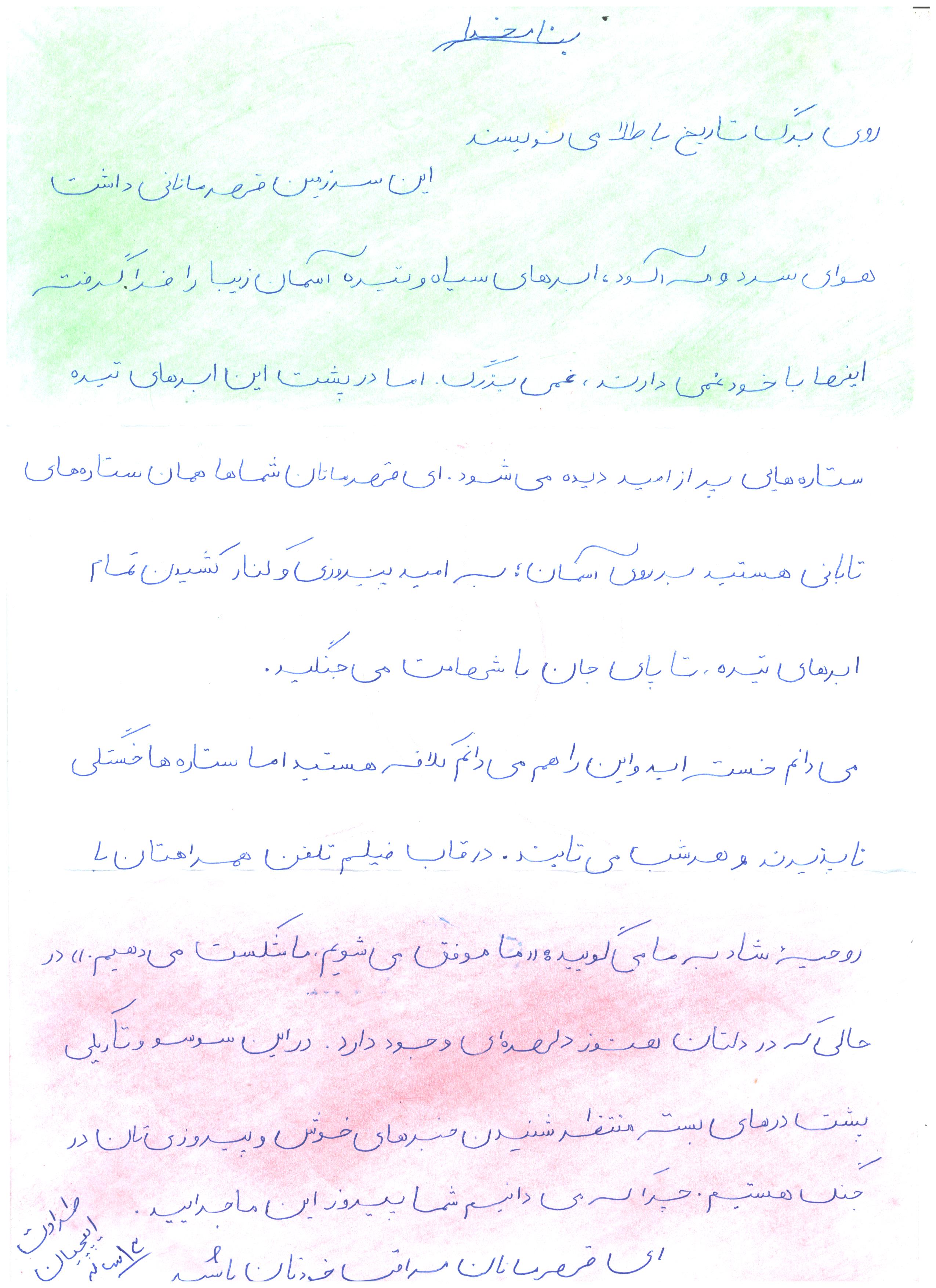متن نامه طراوت ایپچیان دختر 13 ساله تبریز به پرسنل درمانی بیمارستان امام رضا (ع) تبریز به شرح زیر می باشد: