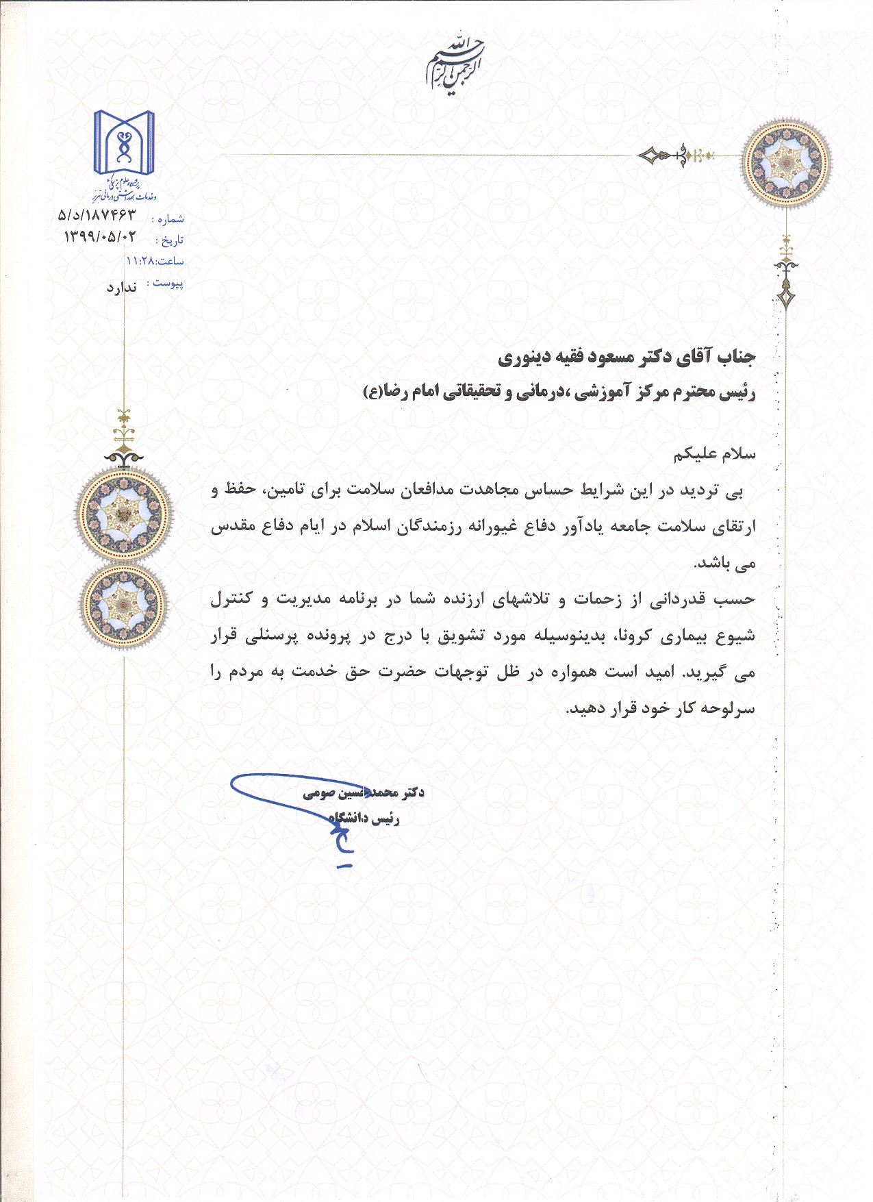 طی نامه ای از سوی دکتر محمد حسین صومی رئیس دانشگاه علوم پزشکی تبریز رئیس مرکزآموزشی و درمانی امام رضا (ع) تبریز به پاس تلاشهای و مجاهدتهای شبانه روزی در بحران کرونا ویروس مورد تشویق قرار گرفت.