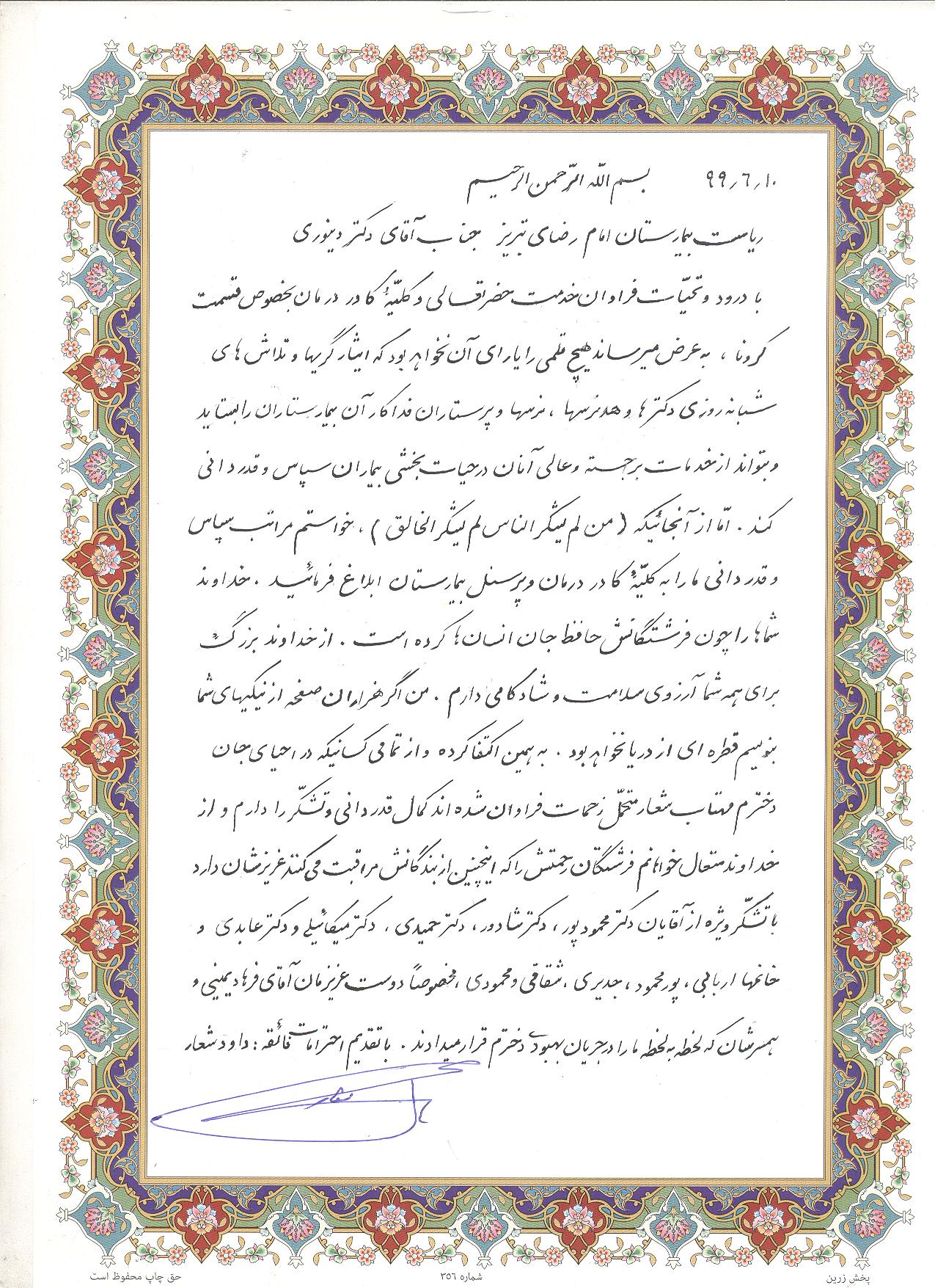 تقدیر و تشکر همشهری قدر دان از زحمات رئیس و همکاران مرکز آموزشی و درمانی امام رضا (ع) تبریز
