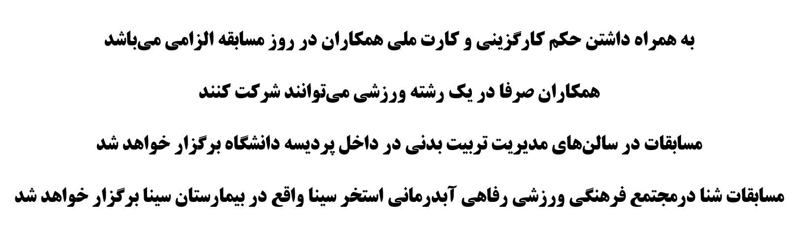 جهت کسب اطلاعات بیشتر با مسئول ورزش مرک آقای مقصود حسینی به شماره 6038 یا خانم حیاتی به شماره 5056 تماس حاصل نمائید.