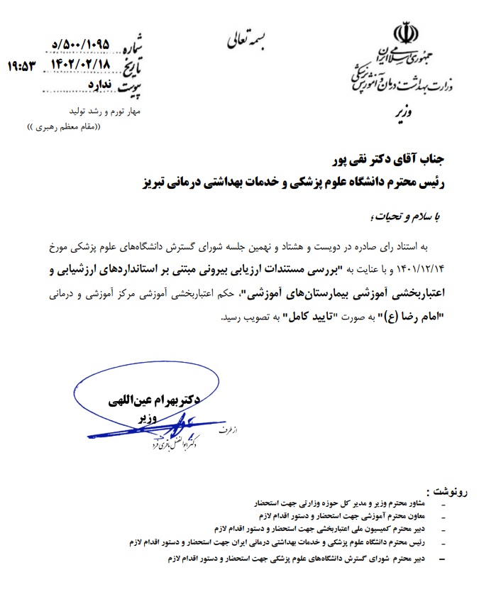 کسب تأییدیه کامل اعتباربخشی آموزشی وزارت بهداشت توسط بیمارستان امام رضا (ع) تبریز