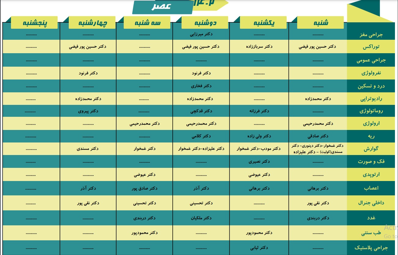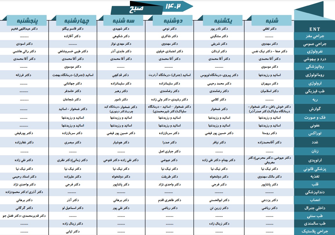 برنامه ویزیت پزشکان کلینیک تخصصی و فوق تخصصی بیمارستان امام رضای تبریز در شیفت صبح و عصر