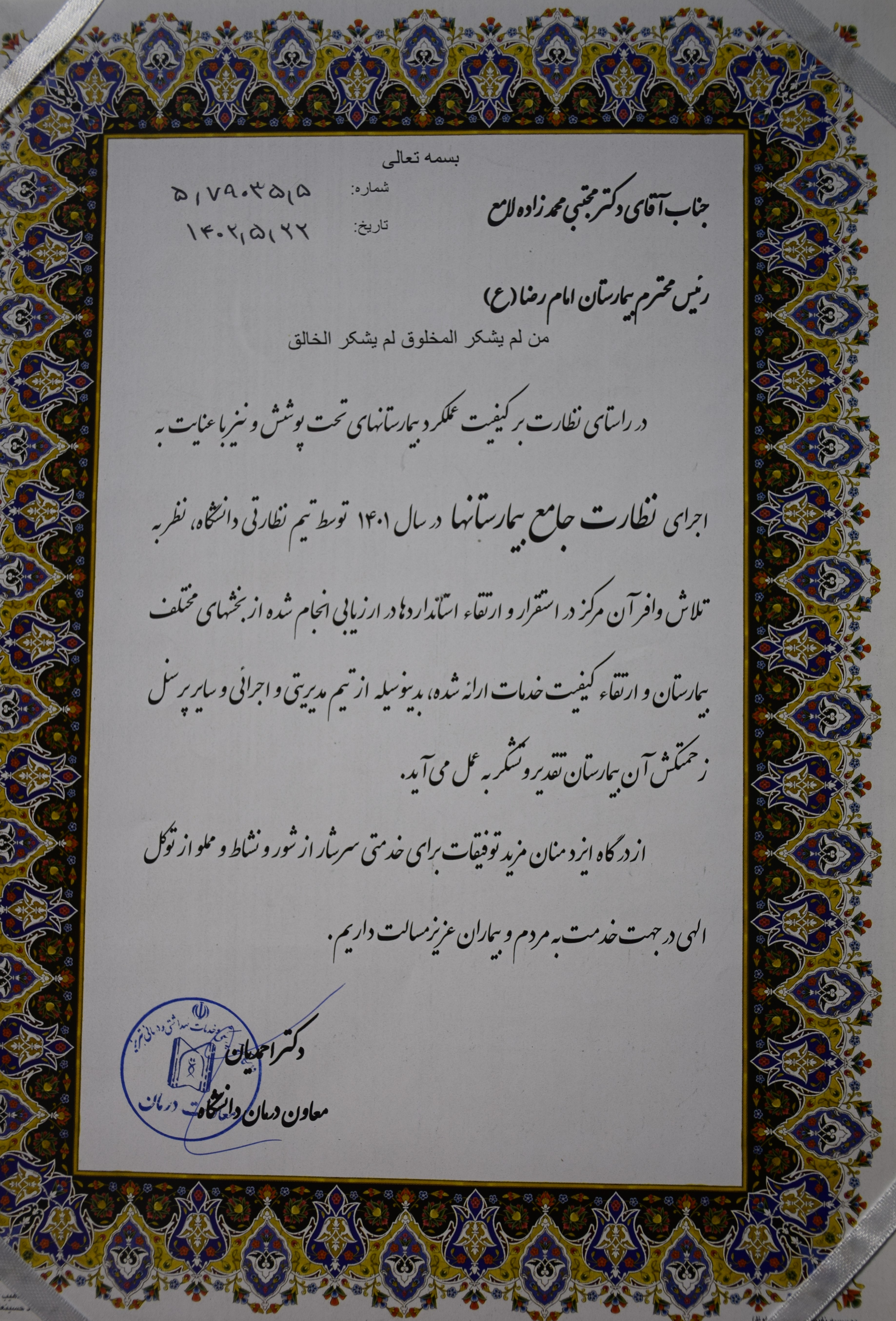 در انتهای برنامه از مرکز آموزشی درمانی و تحقیقاتی امام رضا(ع) تبریز در راستای تلاش مستمر برای ارتقای رتبه اعتبار بخشی با اهدای لوح، تقدیر به عمل آمد.