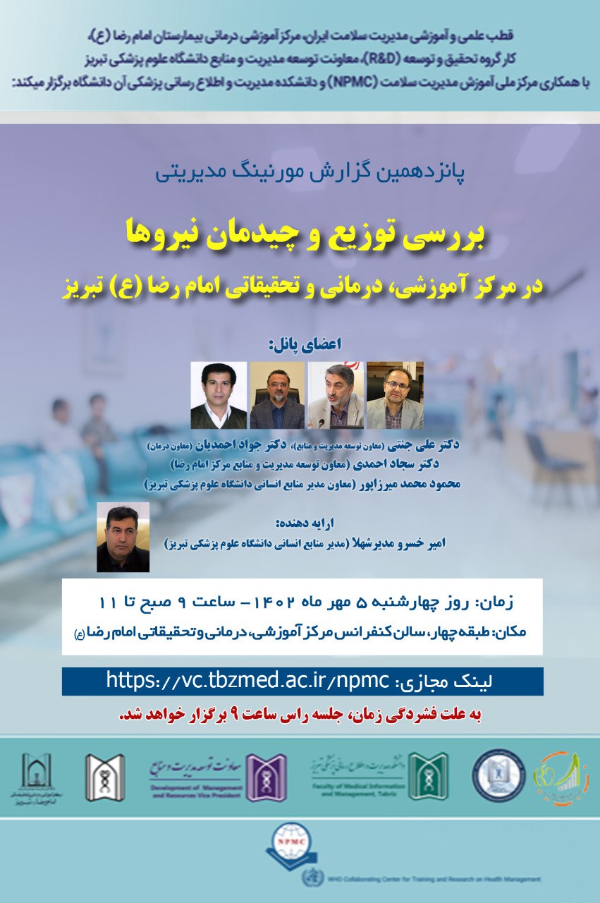 پانزهمین جلسه مورنینگ مدیریتی باعنوان بررسی توزیع وچیدمان نیروها در مرکز آموزشی درمانی امام رضا برگزار می شود.