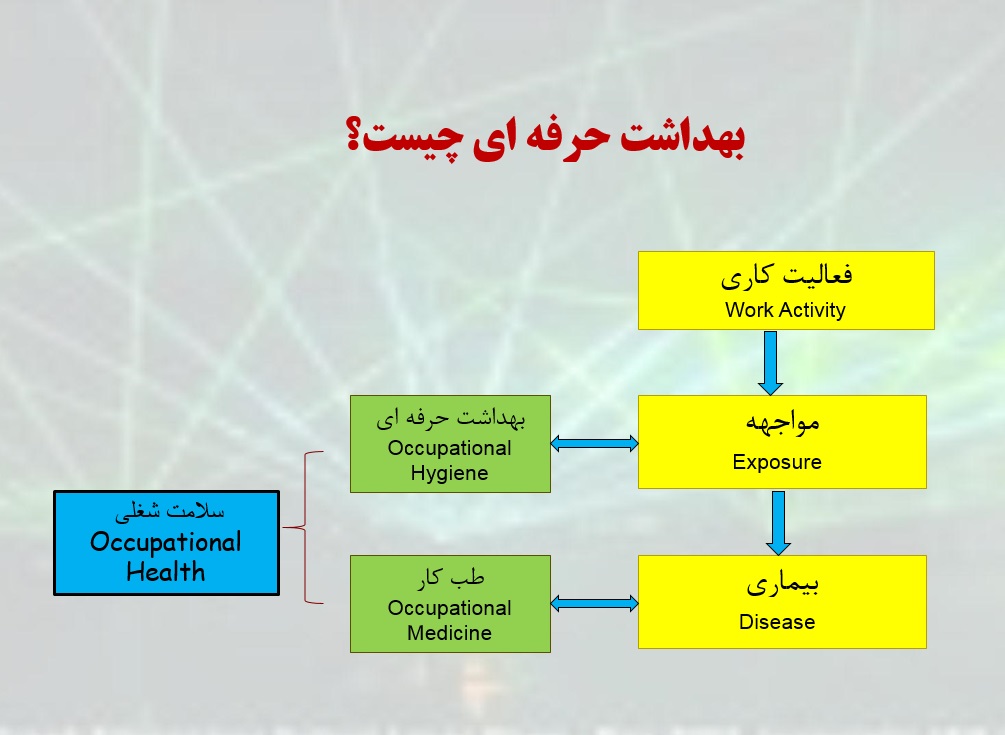 بهداشت حرفه ای شاخه ای از علم بهداشت است که با شناسایی ، ارزشیابی و کنترل عوامل زیان آور در محیط کار از بروز بیماریها و عوارضی که ممکن است توسط عوامل زیان آور فیزیکی ، شیمیایی ، بیولوژ یکی ، ارگونومیکی بوجود آید ، جلوگیری می کند .